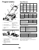Zaustavitev stroja Odstranjevanje akumulatorja iz stroja 1. Za zaustavitev stroja pritisnite gumb za napajanje na sredini zgornjega ročaja. 2. Sprostite krmilni vzvod rezila kosilnice (Diagram 10). 1. Dvignite pokrov ohišja akumulatorja. 2. Pritisnite zatič akumulatorja, da sprostite akumulator in ga odstranite. 3. Zaprite pokrov ohišja akumulatorja. g341360 Diagram 18 Delovni namigi g341392 Diagram 16 3. Splošni napotki za košnjo Varnostni ključ odstranite iz stroja (Diagram 10).