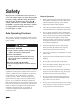 Safety • Do not over-load the attachment and always keep the load level when raising the loader arms. Logs, boards, and other items could roll down the loader arms, injuring you. • Raising the loader arms on a slope will affect the stability of the machine. Whenever possible, keep the loader arms in the lowered position when on slopes. • Never jerk the control levers; use a steady motion. • • Keep your hands, feet, hair, and loose clothing away from any moving parts.