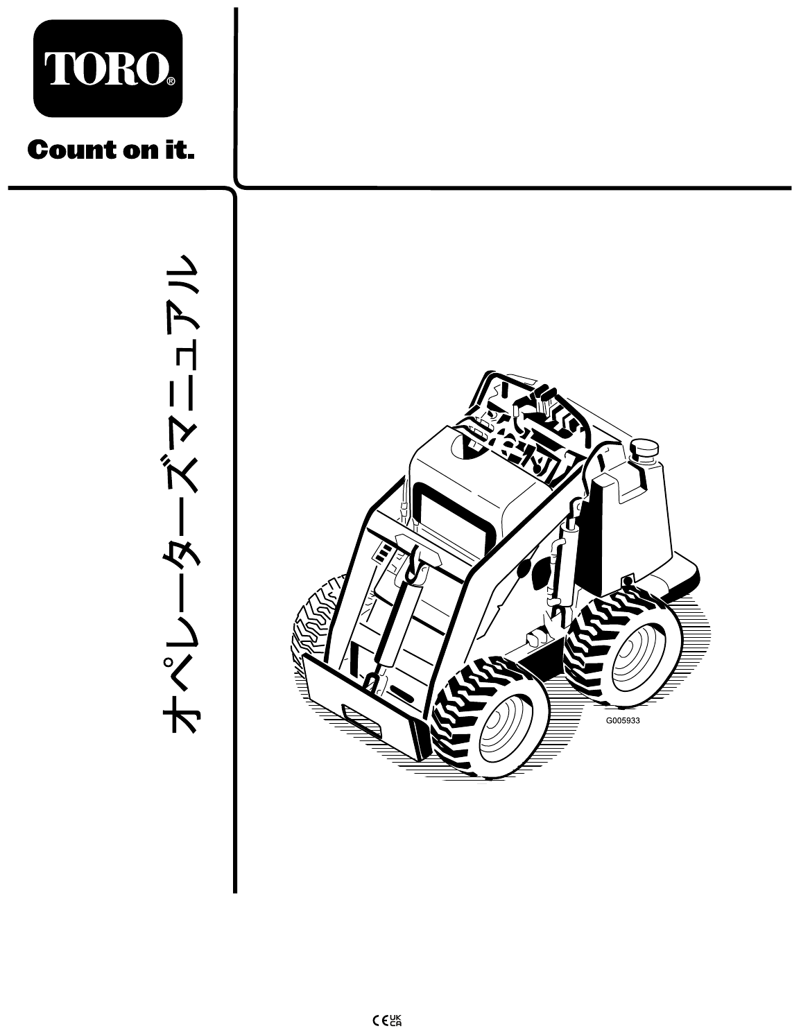 • Toro が認めていないアタッチメントやアクセサリは • • • • • • • • • • • • • • • 使用しないでください。アタッチメントによって機体 全体の安定性や運転特性が変わることがあります ので注意してください。 プラットフォーム付きのマシンの場合 – プラットフォームから降りる前にアームを降ろし てください。 – 足を地面に突っ張って機体を安定させようとする のは非常に危険ですからやめてください。車両 をコントロールすることができなくなったら、マシ ンの運動方向と反対側に飛び降りてください。 – 機械の下から手足を差し入れないでください。 – 必ず両足で運転台に立ち両手でバーをつかんだ 状態で運転操作してください。 この機械を運転する時は常に十分な注意を払ってく ださい。運転中は運転操作に集中してください注意 散漫は事故の大きな原因となります。 バックするときには、足元と後方の安全に十分な 注意を払ってください。 コントロール類は絶対に急激な操作をせず、安定し た操作を行ってください。 オーナーやユーザーは自分自身や他の安全に責任 があり、オペレータやユーザーの注意によっ