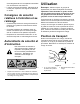 • Évitez de démarrer ou de vous arrêter en côte. • N'approchez jamais les mains ou les pieds des • • • Si la machine perd de sa motricité, descendez lentement la pente en ligne droite. composants et accessoires mobiles. N'utilisez pas la machine s'il manque des capots ou d'autres dispositifs de protection, ou s'ils sont endommagés. Tenez tout le monde et tous les animaux à une distance suffisante de la machine.