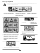 99–5172 107-2915 1. Takertumisvaara, akseli – pidä sivulliset turvallisen etäisyyden päässä koneesta. 117–4979 1. Takertumisvaara, hihna – pysy etäällä liikkuvista osista. Pidä kaikki suojukset ja suojalevyt paikoillaan. 107-2926 1. Silpoutumisvaara, siipipyörä – pysy etäällä liikkuvista osista. 2. Esineiden sinkoutumisvaara – pidä sivulliset turvallisen matkan päässä koneesta. 105–9553 93–7301 1. Vaara – lue käyttöopas. 2. Kaatumisvaara – laske leikkuuyksikkö, kun ajat rinnettä alas.