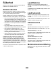 Säkerhet Ljudeffektnivå Maskinen har utformats i enlighet med SS-EN ISO 5395:2013 och ANSI B71.4-2012. Maskinen har en garanterad ljudeffektnivå på 105 dBA, som omfattar ett osäkerhetsvärde (K) på 0,7 dBA. Allmän säkerhet Ljudeffektsnivån har fastställts enligt de rutiner som beskrivs i ISO 11094. Maskinen kan slita av händer och fötter och kasta omkring föremål. Följ alltid alla säkerhetsanvisningar för att undvika allvarliga personskador.
