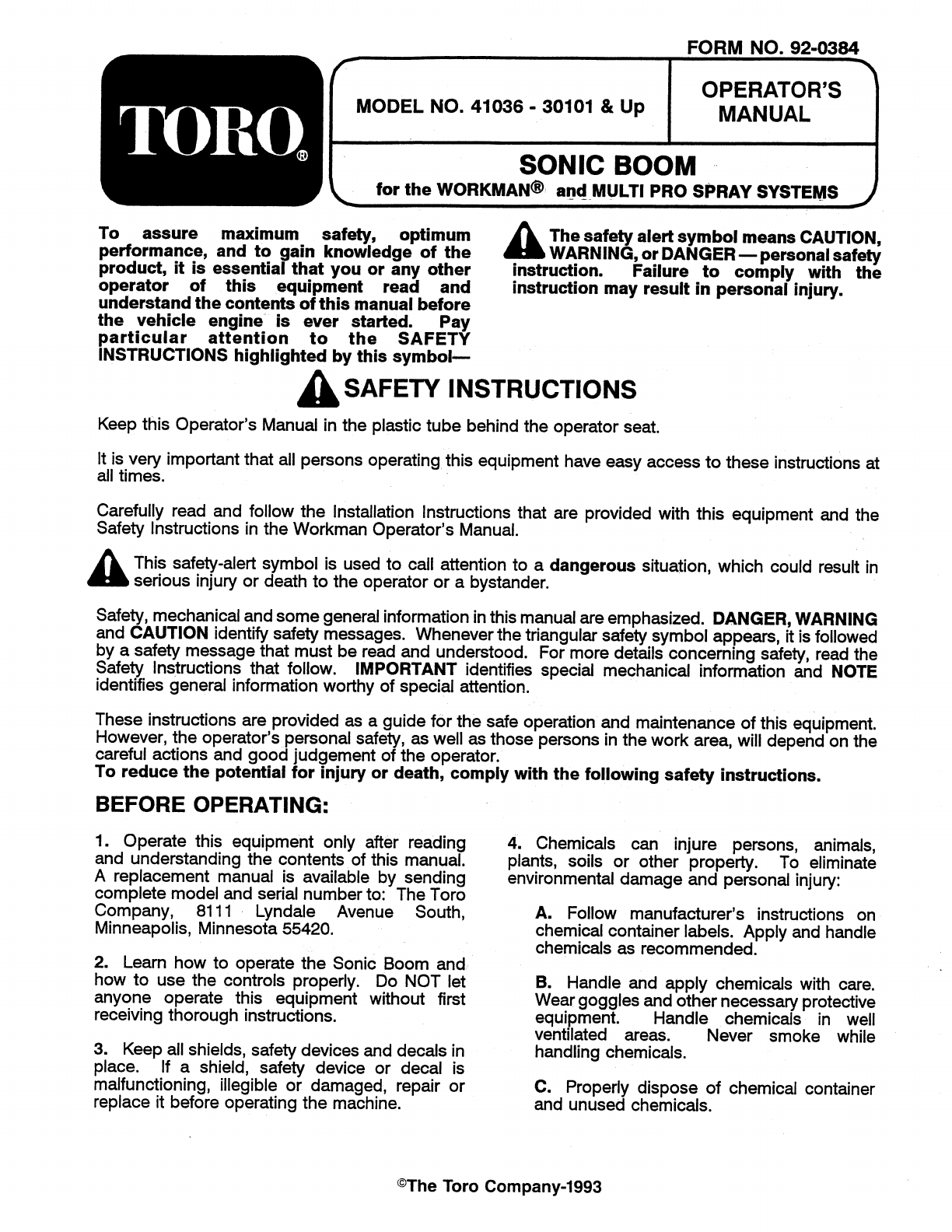 MODEL NO. 41036 30101 & Up FORM NO. 92-0384 OPERATOR'S MANUAL To assure performance, and to gain knowledge of the product, it is essential that you or any other maximum safety, optimum operator of this equipment read and understand the contents of this manual before the vehicle engine Is ever started. Pay particular attention te the SAFETY INSTRUCTIONS highlighted by this symbol-— SONIC BOOM J L for the WORKMAN®.