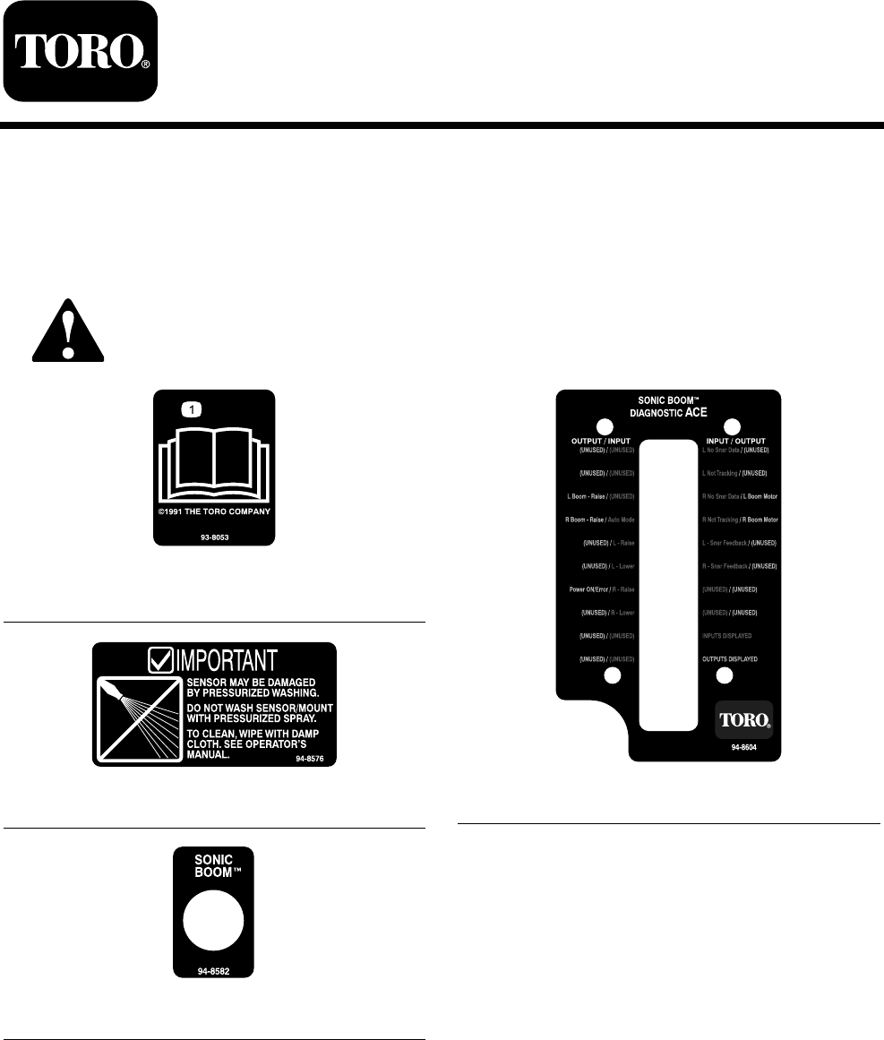 Sonic Boom Kit Form No. 3354-145 Rev B For Multi-Pro Turf Sprayers Model No. 41217—Serial No. 260000001 and Up Installation Instructions Safety Safety and Instructional Decals Safety decals and instructions are easily visible to the operator and are located near any area of potential danger. Replace any decal that is damaged or lost. 93-8053 1. Read the Operator’s Manual. 94-8604 94-8576 94-8582 © 2005—The Toro® Company 8111 Lyndale Avenue South Bloomington, MN 55420 Register at www.Toro.com.