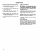 OPERATION FILLING THE SOLUTION TANK: (Cont'd) 1. Most chemicals are heavier than the water to which they are introduced. 2. Fill the spray tank 1/2 full with clear water from a clean source. 3. Start vehicle and tum on pump with booms off and by-pass fully open. 4. Begin adding the chemicals very gradually, allowing the pump and agitation to fully mix the chemicals. 5. Fill the remainder of the tank with clear water. USING THE SPRAYER: IMPORTANT: Do not operate the pump dry.