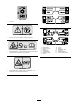Turva- ja ohjetarrat Turva- ja ohjetarrat on sijoitettu hyvin näkyville paikoille mahdollisten vaara-alueiden lähettyville. Korvaa vioittuneet tai kadonneet tarrat uusilla. 106-5065 107-8621 1. Säiliön kierto päällä 2. Portaaton säätö 3. 1. 2. Säiliön kierto pois Käynnissä Säiliön tyhjennys 3. Pois 106-5016 1. 2. 3. Vaara – lue käyttöopas. Sähköiskuvaara, voimalinjoja yläpuolella – varo voimalinjoja. Ruhjoutumisvaara, puomi – pidä sivulliset turvallisen matkan päässä koneesta. 106-1425 1.