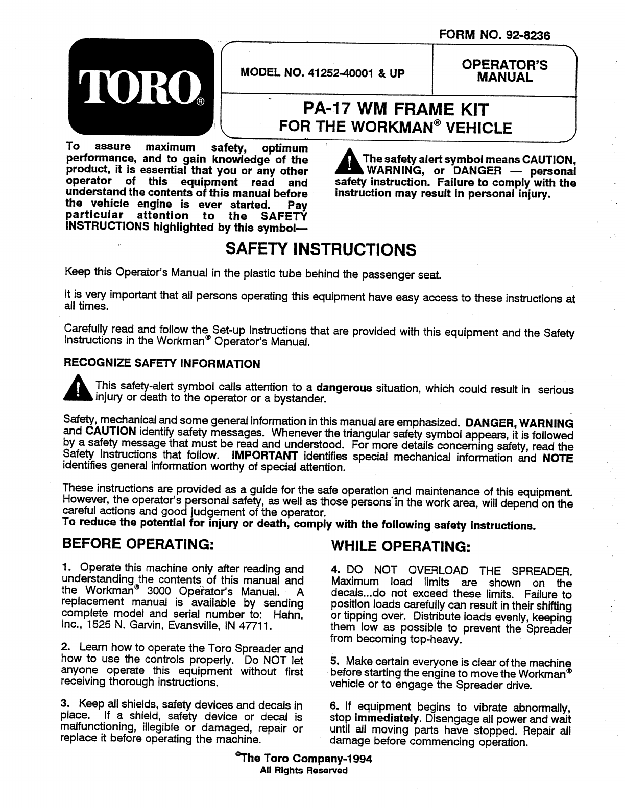 FORM NO. 92-8236 MODEL NO. 41252-40001 & UP OPERATOR'S MANUAL PA-17 WM FRAME KIT FOR THE WORKMAN® VEHICLE To assure maximum performance, and to gain knowledge of the product, it is essential that you or any other safety, optimum operator of this equipment read and understand the contents of this manual before the vehicle “engine sever “started.