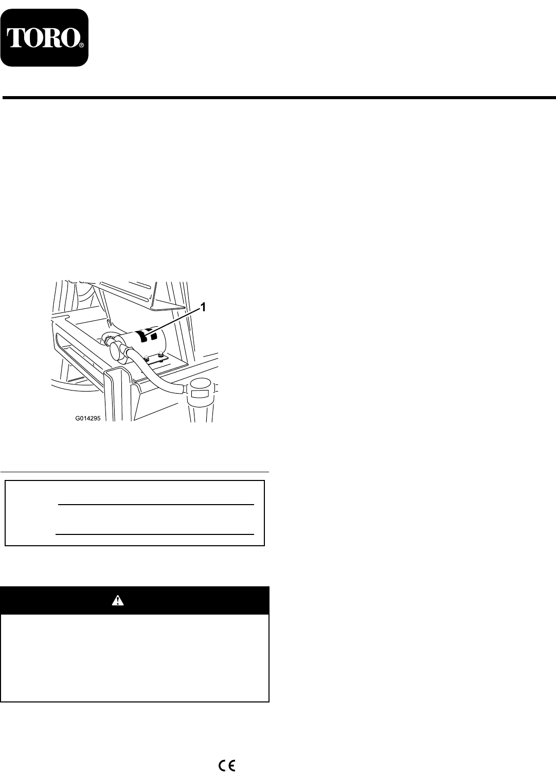 Form No. 3438-142 Rev A 수세조 키트 Multi-Pro 5800 잔 디 스 프 레 이 어 일련번호 401100000 및 그 이상 모델 번호 41614—일 설치 지침 소개 이 키트는 스프레이어 탱크 및 관련 호스에서 잔여 화 학물질을 제거하도록 고안되었습니다. 잔디 살포용 차량 전용 부착 장치이며 전문 작업자가 상업용으 로 사용해야 합니다. 본 설명서의 정보는 운전자와 작업자가 부상을 당하거 나 장비에 손상을 입히는 사고를 방지하도록 돕습니다. 그림 1은 제품의 모델 및 일련번호의 위치를 알려 줍니다. g014295 그림 1 1. 모델 번호 및 일련 번호판 모델 번호 일련번호 참고: 정상 운전 위치에서 장비의 좌측과 우측을 판 단하십시오. 경고 캘리포니아 Proposition 65 경 고 본 제품의 사용으로 캘리포니아 주에서 암, 선 천성 기형 및 기타 생식 기능 장애를 일으키는 것으로 알려진 화학 물질이 들어 있습니다.