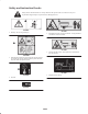 Safety and Instruction Decals Safety decals and instructions are easily visible to the operator and are located near any area of potential danger. Replace any decal that is damaged or lost. 93-9867 99-0015 1. Warning—do not carry passengers. 1. Entanglement hazard, conveyor and brush—keep bystanders a safe distance from the machine. 93-9092 1. Crushing hazard of hand—keep bystanders a safe distance from the machine. 105-4586 1. Entanglement hazard, belt—stay away from moving parts.