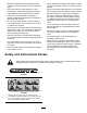 • Become familiar with the safe operation of the • Never operate with the discharge deflector raised, equipment, with the operator controls, and safety signs. removed, or altered, unless you are using a grass catcher. • Keep your hands and feet away from moving parts. • Use extra care with grass catchers or other Do not make adjustments with the engine running. attachments. These can change the operating characteristics and the stability of the machine.