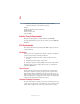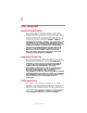 Portégé 2000 User’s Guide ® If you need assistance: ❖ VirtualTechTM http://virtualtech.toshiba.com ❖ InTouch® Center Calling within the United States (800) 457-7777 Calling from outside the United States (949) 859-4273 For more information, see Chapter 8 on page 148. TOSHIBA C6609-1201M1 5.375 x 8.375 ver 2.3.
