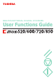 PREFACE Thank you for purchasing the Toshiba Multifunctional Digital Systems e-STUDIO520/600/720/850. This Operator’s Manual describes the following: • How to set up the Multifunctional Digital Systems. • How to operate the functions in the [USER FUNCTIONS] button. Before using the Multifunctional Digital Systems, thoroughly read and understand this Operator's Manual.