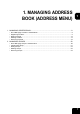 1. MANAGING ADDRESS BOOK (ADDRESS MENU) 1 1. MANAGING ADDRESS BOOK..............................................................................................8 • • • • • About Managing Contacts in Address Book........................................................................................8 Registering Contacts ...........................................................................................................................9 Editing Contacts .............................................