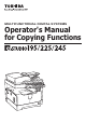 Before Reading This Manual Lineup of our manuals These manuals are provided for the operation of the e-STUDIO195/225/245. Select and read the manual best suited to your needs. This manual is the Operator’s Manual for Copying Functions. Basic functions Operator’s Manual for Copying Functions (Booklet, This manual) This manual describes the basic operations, mainly copying functions, of this equipment. It also describes safety precautions to ensure correct and safe use of this equipment.