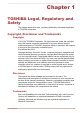 Table of Contents Chapter 1 TOSHIBA Legal, Regulatory and Safety Copyright, Disclaimer and Trademarks .............................................. 1-1 Regulatory Information ......................................................................... 1-2 Video Standard Notice .......................................................................... 1-7 OpenSSL Toolkit License Issues ......................................................... 1-7 FreeType License Issues .......................................