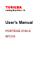 Series Model Name PORTÉGÉ Z10t-A WT310 Operating Mode Supported Laptop mode: when TOSHIBA Keyboard Dock is docked Tablet mode: when TOSHIBA Keyboard Dock is undocked Tablet mode only Conventions This manual uses the following formats to describe, identify, and highlight terms and operating procedures. SSD or Solid State Drive This computer is equipped with a Solid State Drive (SSD). Click Tap the Touch Pad or click the left Touch Pad control button once (laptop mode). Left click the mouse once.