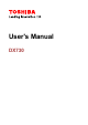 DX730 Copyright © 2011 by TOSHIBA Corporation. All rights reserved. Under the copyright laws, this manual cannot be reproduced in any form without the prior written permission of TOSHIBA. No patent liability is assumed, with respect to the use of the information contained herein. First edition September 2011 Copyright authority for music, movies, computer programs, databases and other intellectual property covered by copyright laws belongs to the author or to the copyright owner.