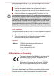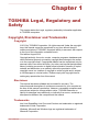 Table of Contents Chapter 1 TOSHIBA Legal, Regulatory and Safety Copyright, Disclaimer and Trademarks .............................................. 1-1 Regulatory Information ......................................................................... 1-2 Video Standard Notice .......................................................................... 1-7 OpenSSL Toolkit License Issues ......................................................... 1-7 ENERGY STAR® Program ..........................................