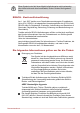 Kapitel 1 TOSHIBA-Informationen zu Recht, Zulassung und Sicherheit In diesem Kapitel werden rechtliche sowie zulassungs- und sicherheitsrelevante Hinweise, die für TOSHIBA-Computer gelten, aufgeführt. Copyright, Haftungsausschluss und Marken Copyright © 2015 TOSHIBA Corporation. Alle Rechte vorbehalten. Jede Wiedergabe oder Verwertung außerhalb der durch das Copyright erlaubten Grenzen ist ohne vorherige schriftliche Genehmigung seitens TOSHIBA unzulässig.
