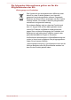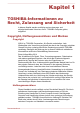 Kapitel 1 TOSHIBA-Informationen zu Recht, Zulassung und Sicherheit In diesem Kapitel werden rechtliche sowie zulassungs- und sicherheitsrelevante Hinweise, die für TOSHIBA-Computer gelten, aufgeführt. Copyright, Haftungsausschluss und Marken Copyright ©2014 by TOSHIBA Corporation. Alle Rechte vorbehalten. Jede Wiedergabe oder Verwertung außerhalb der durch das Copyright erlaubten Grenzen ist ohne vorherige schriftliche Genehmigung seitens TOSHIBA unzulässig.