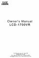 Specifications l LCD-1700VR 17” LCD 8U Rack Display Monitor Overall Dimension(HxWxD): Effective Display area(H/V): Display colors: Scan Frequencies: Horizontal Vertical Number of Pixels: Pixel pitch: Picture Tube: Power: Input Consumption PC RGB Connector: Audio connector Speaker RGB Signals: Video Sync Display Data Channel: Compatibility Video connector input S-connector AV connector Mini D type BNC connector Video connector output BNC connector 394.5 x 436 x 62 mm 337.92 x 270.34 mm 16M colors 31.