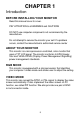 CHAPTER 1 Introduction BEFORE INSTALLING YOUR MONITOR Read this manual cover to cover. PAY ATTENTION to all WARNING and CAUTIONS DO NOT use computer components not recommend by the manufacture Do not attempt to service the monitor your self. If a problem occurs, contact the manufacture's authorized service center ABOUT YOUR MONITOR This monitor is a microprocessor-controlled, color monitor that uses a TFT LCD panel.