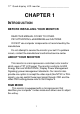 17” Quad display LCD monitor ______________________ CHAPTER 1 INTRODUCTION BEFORE INSTALLING YOUR MONITOR READ THIS MANUAL COVER TO COVER. PAY ATTENTION to all WARNING and CAUTIONS DO NOT use computer components not recommend by the manufacture Do not attempt to service the monitor your self. If a problem occurs, contact the manufacture's authorized service cente r ABOUT YOUR MONITOR This monitor is a microprocessor-controlled, color monitor which uses a TFT LCD panel.