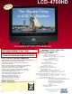 LCD- 4700HD with d 32 an RS-2 & DVI I HDM The Biggest Thing in LCD HD Monitors Active Matrix 47" Color LCD HD Monitor • True HD displays 1080p/i without down scaling. (also supports 480p/i, 576p/i, 720p) • RS-232 feature allows external devices to control the monitor through the serial port. Resolution: 1920 (H) x 1080 (V) dots Brightness rating: 550 cd/m² (Nit) Contrast Ratio: 1600:1 Display: 47.