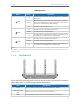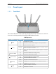 Chapter 1 Get to Know About Your Router 1. 3. Panel Layout 1. 3. 1. Front Panel The router’s LEDs are located on the top panel (view from top to bottom). You can check the router’s working status by following the LED Explanation table. LED Explanation Name (LED) (Power) (Wireless 2.4GHz) (Wireless 5GHz) Status On All LEDs work normally. Off All LEDs are off without affecting the router’s performance. On System initialization completes.