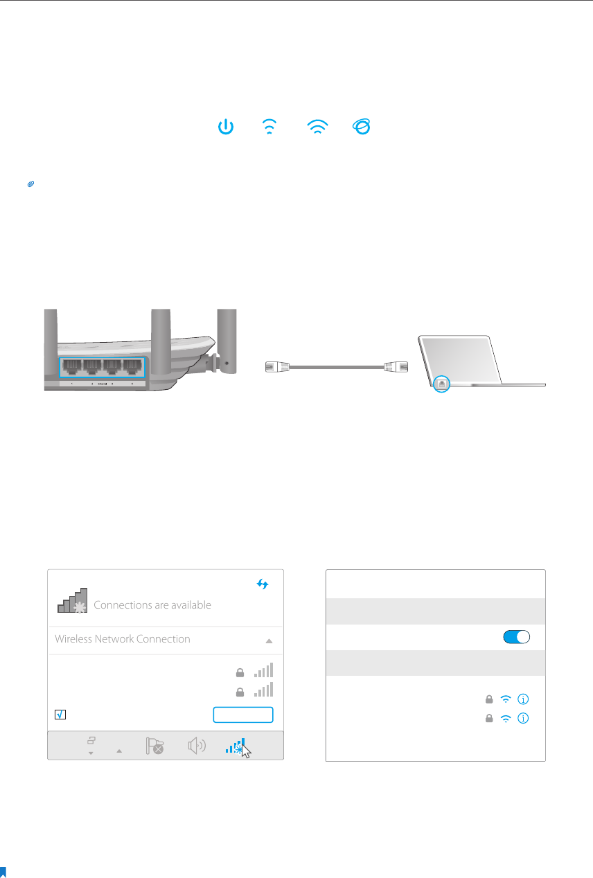 Tips: If 2.4GHz LED and 5GHz LED are off, press the WPS/Wi-Fi On/Off button for about 2 seconds, and then