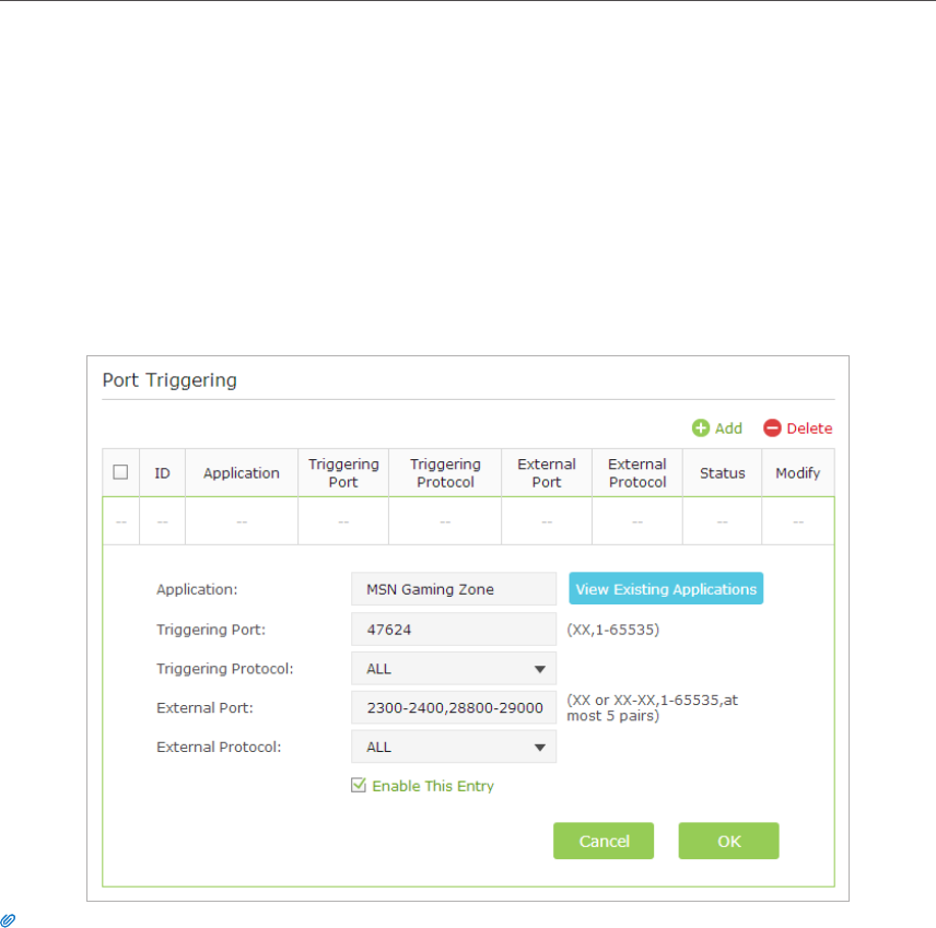 2. Go to Advanced > NAT Forwarding > Port Triggering and click Add.