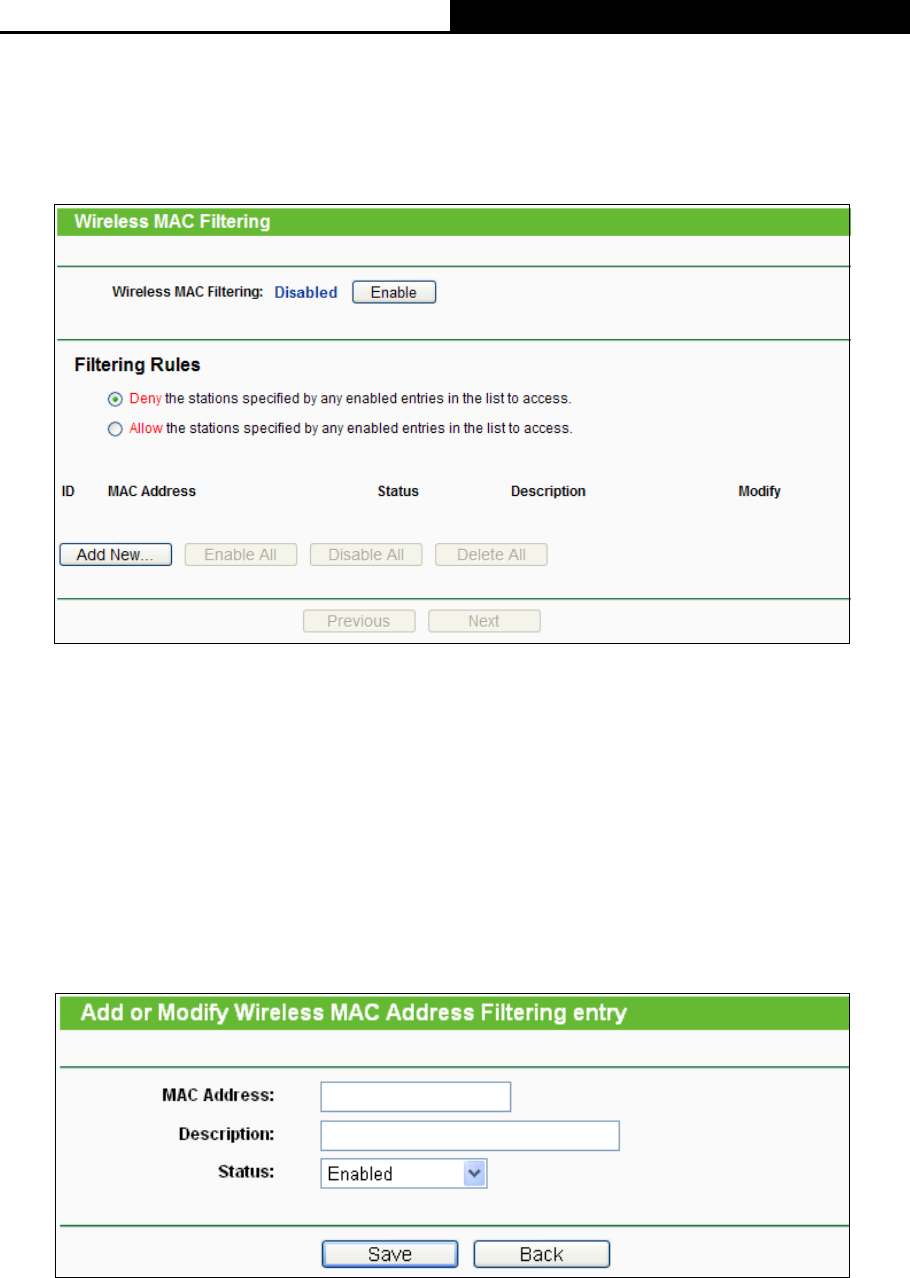 Wireless MAC Address Filtering entry" page will appear, shown in Figure 4-25: