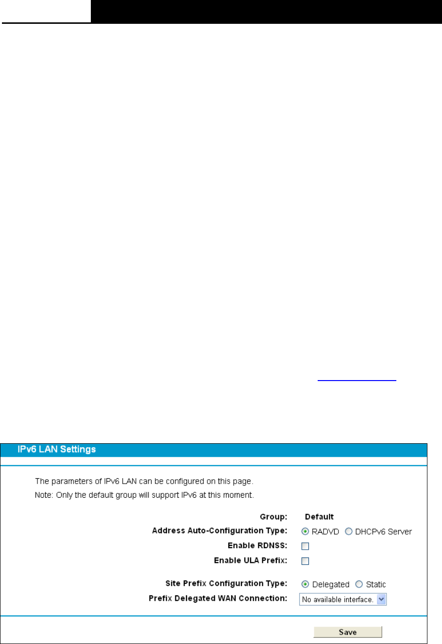 Choose menu “Network”“IPv6 LAN Settings”, you can configure LAN IPv6 interface for your