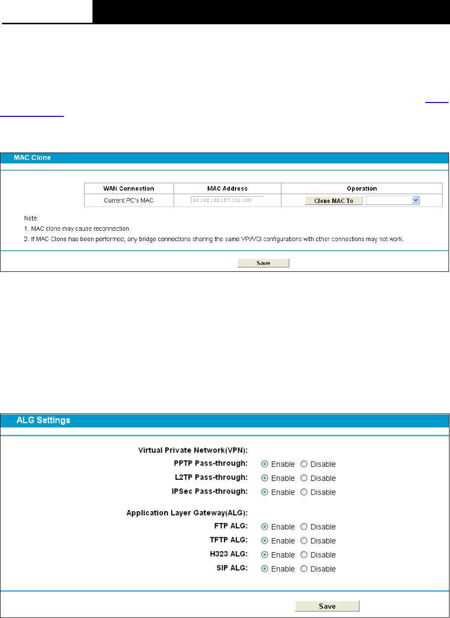 Choose menu “Network”“MAC Clone”, you can configure the MAC address of the WAN