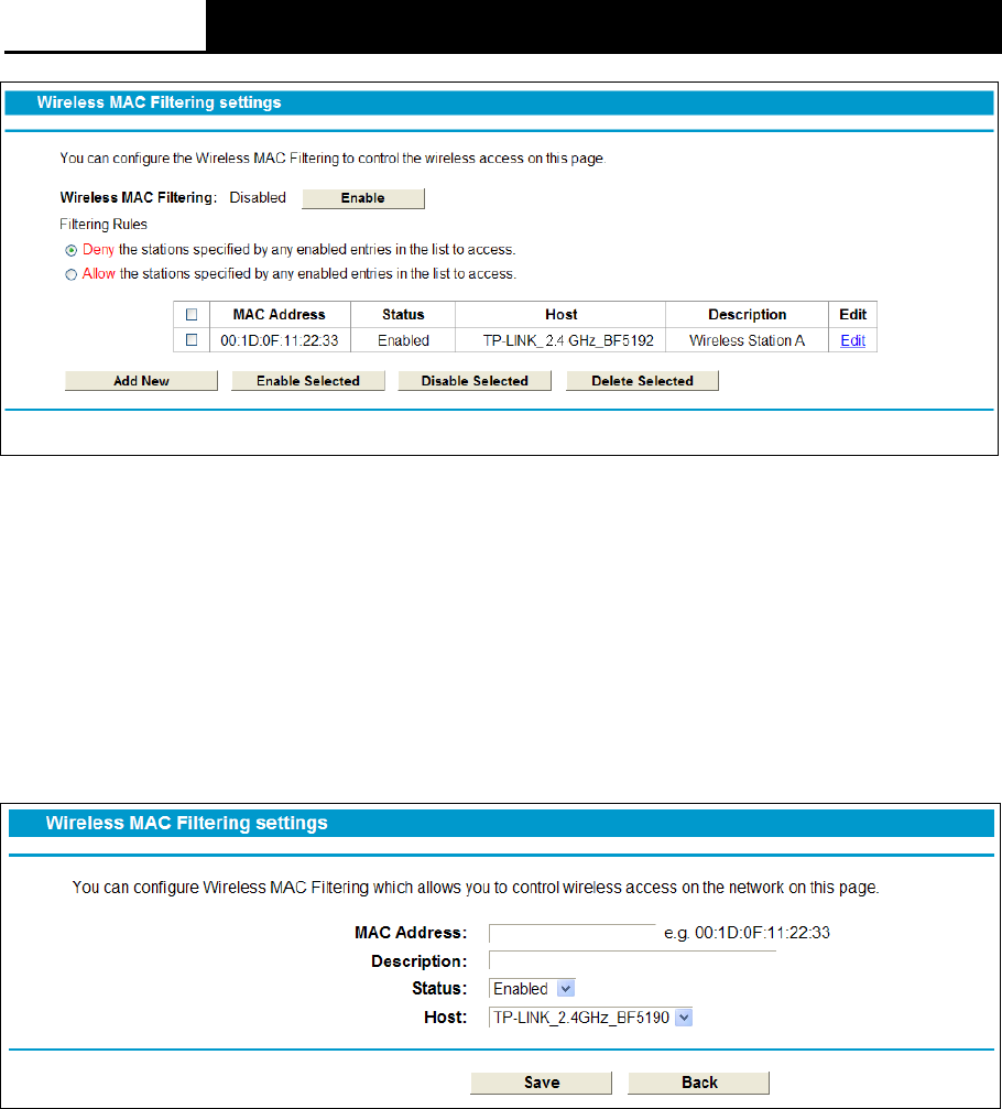 To Add a Wireless MAC Address filtering entry, click the Add New button. The following page will