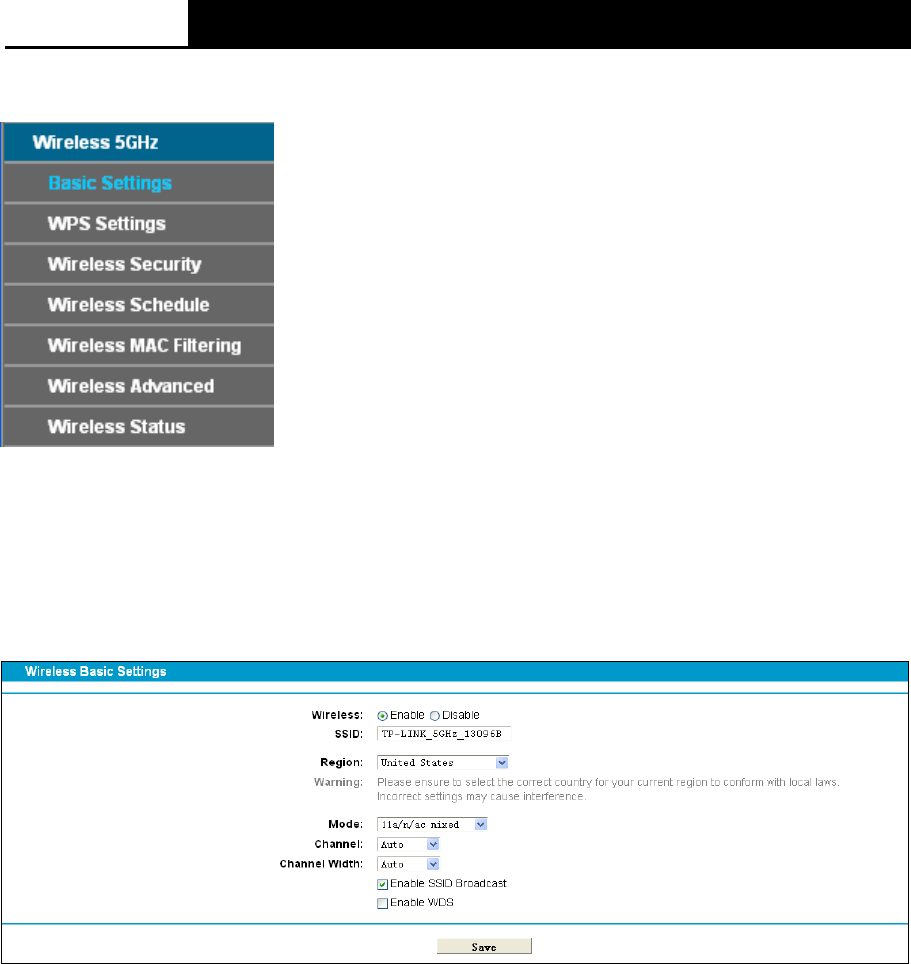 There are seven submenus under the Wireless 5GHz menu: Basic Settings, WPS Settings,