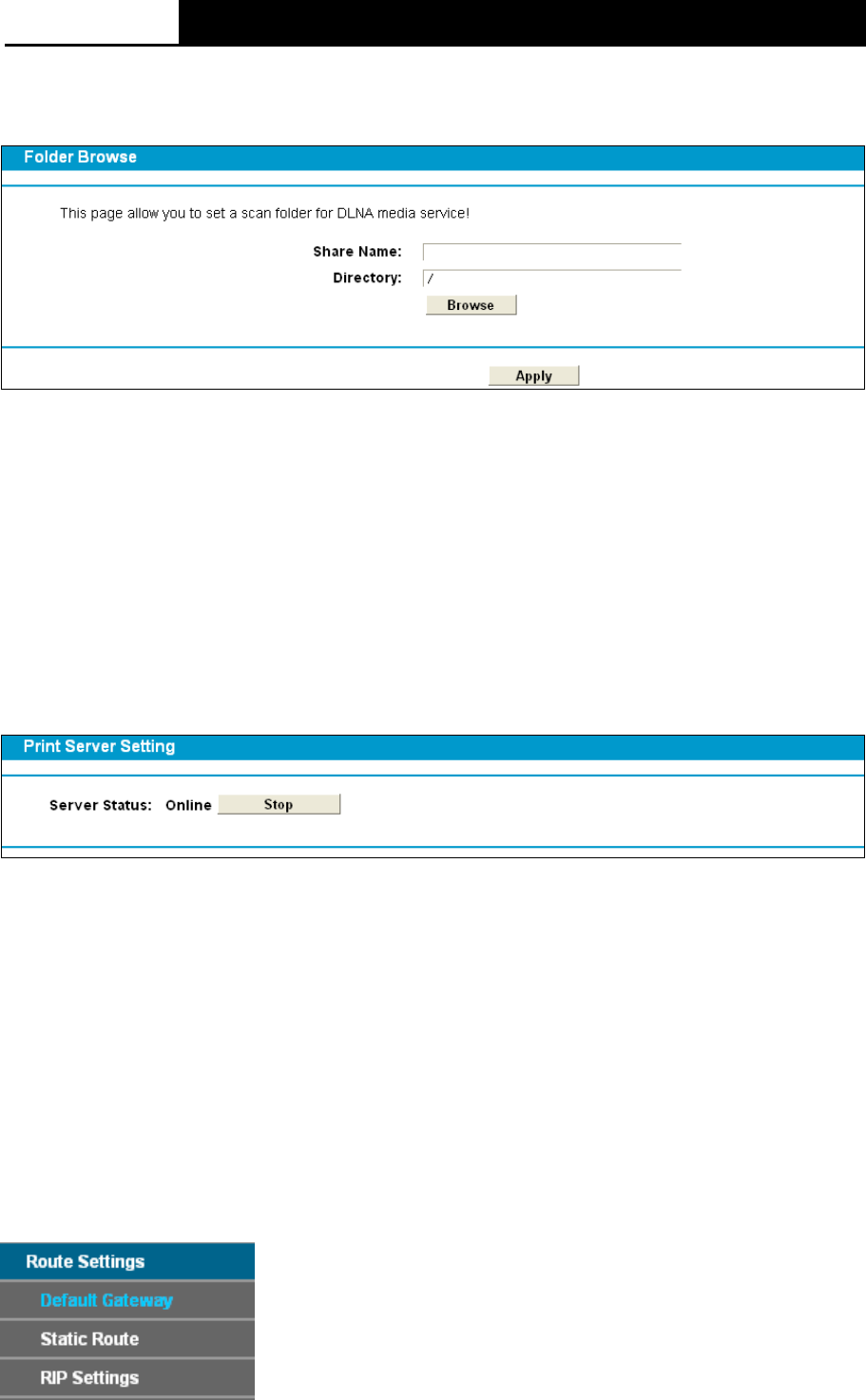 Choose “Route Settings”, it includes three menus: Default Gateway, Static Route and RIP