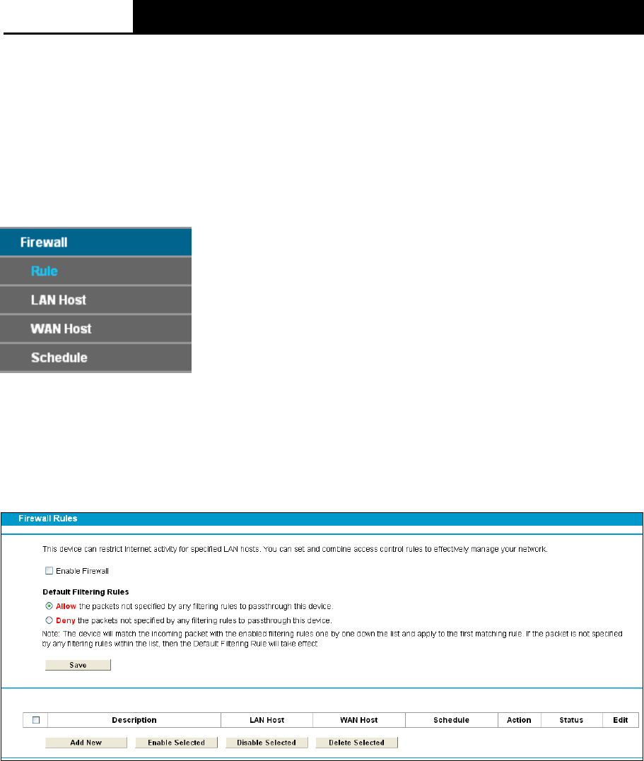 There are four submenus under the Firewall menu: Rule, LAN Host, WAN Host and Schedule.