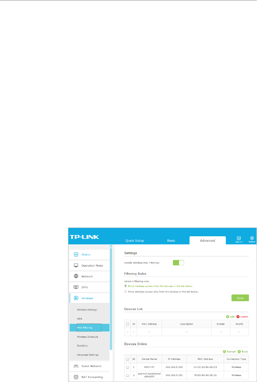 2. Go to Advanced > Wireless > MAC Filtering and enable