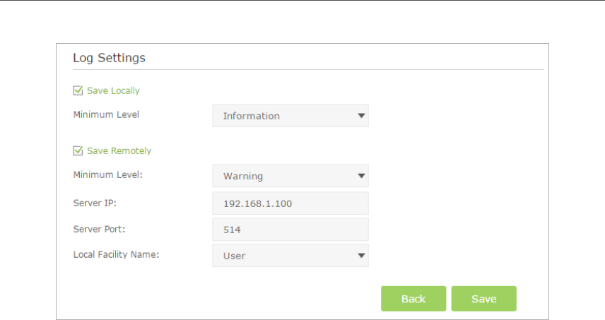 • Save Locally: Select this option to cache the system log to the router’s local memory,