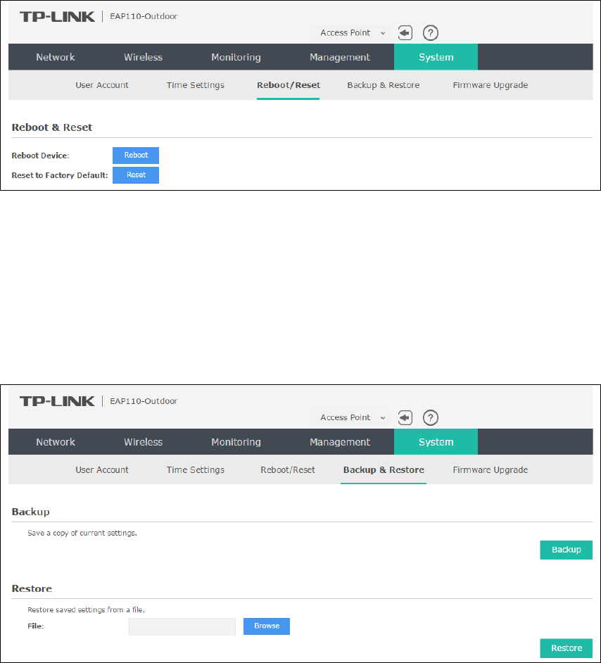Click Reboot to restart the device. Click Reset to restore the device to factory default