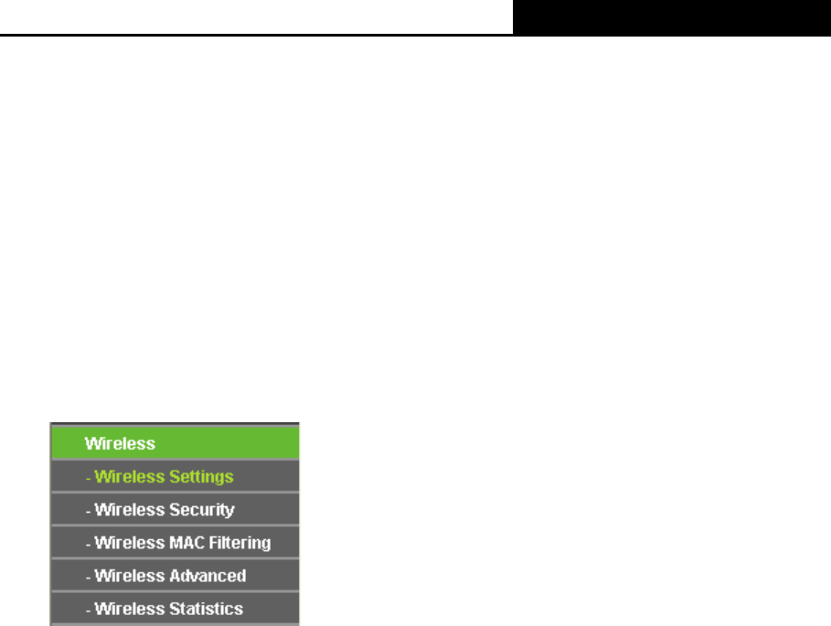 Wireless Security, Wireless MAC Filtering, Wireless Advanced and Wireless Statistics.