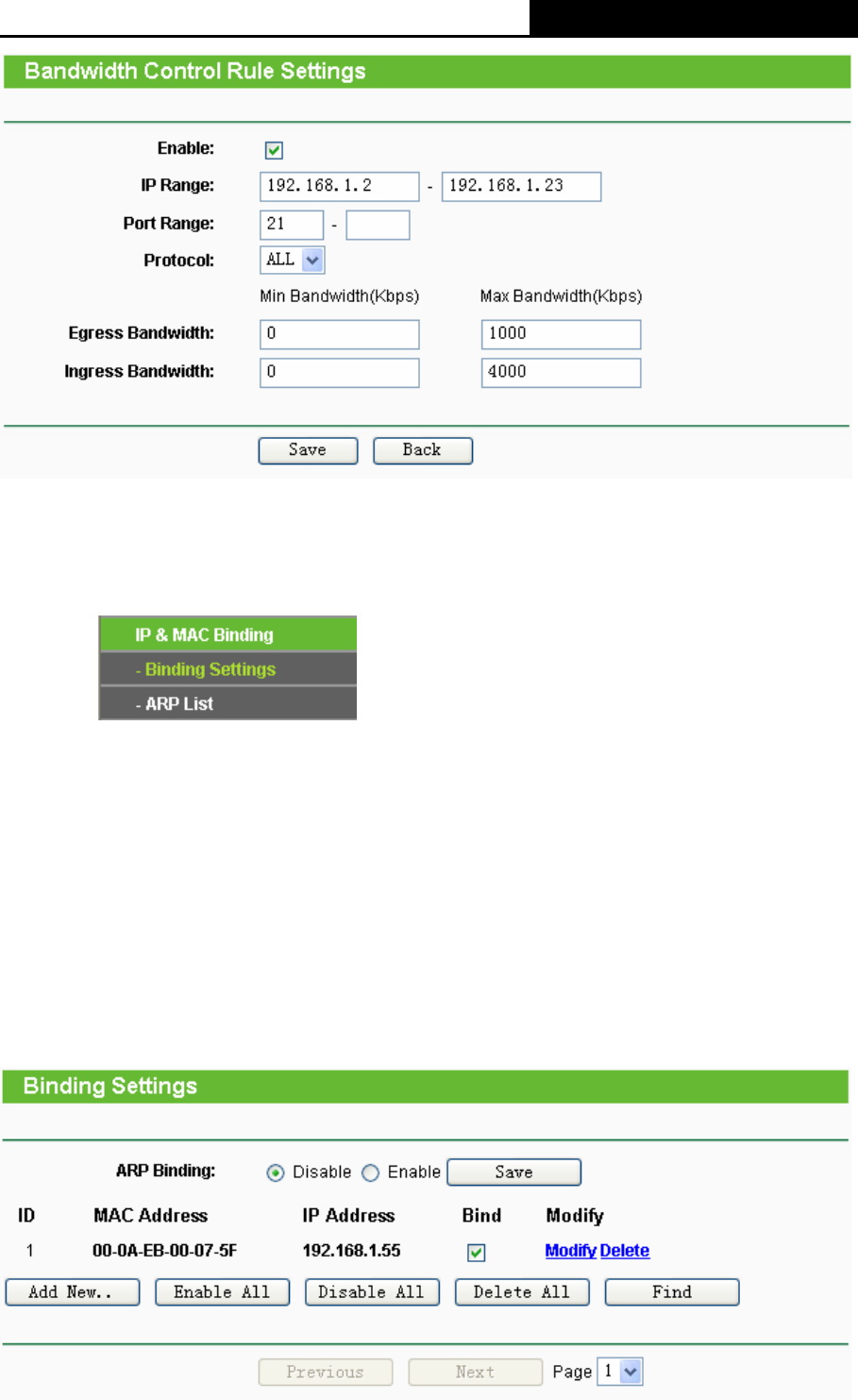 This page displays the IP & MAC Binding Setting table; you can operate it in accord with your