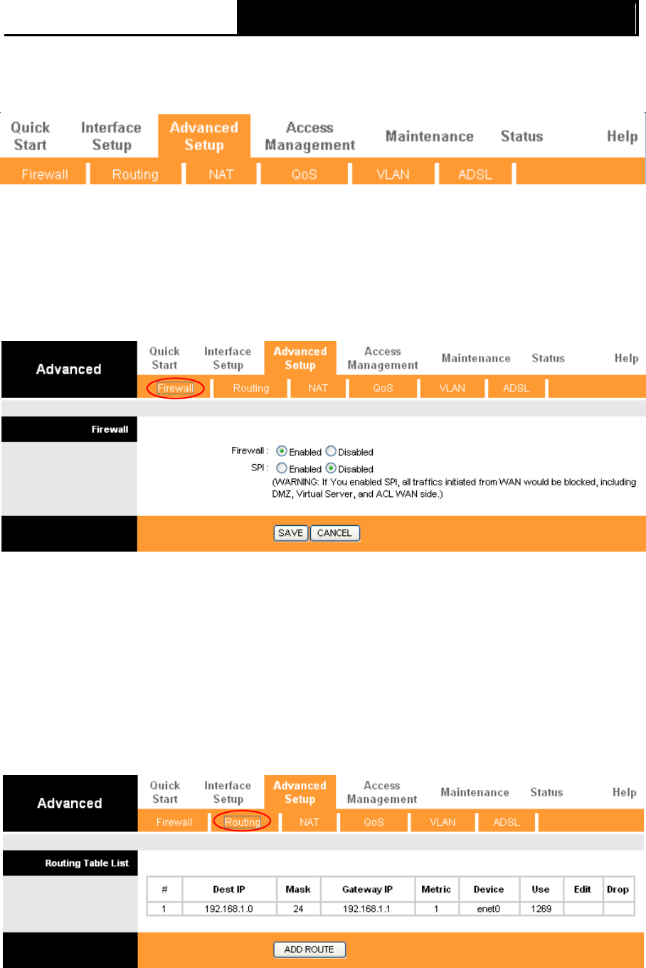 Choose “Advanced Setup→Firewall” menu, and you will see the next screen (shown in Figure