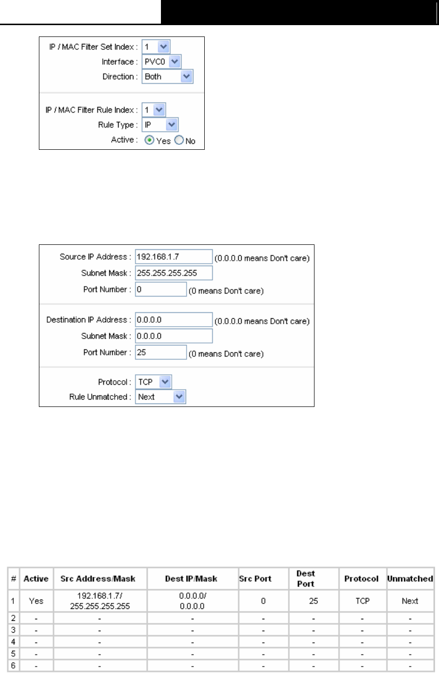 Select the IP / MAC Filter Set Index and IP/MAC Filter Rule Index to locate the specific rule, and