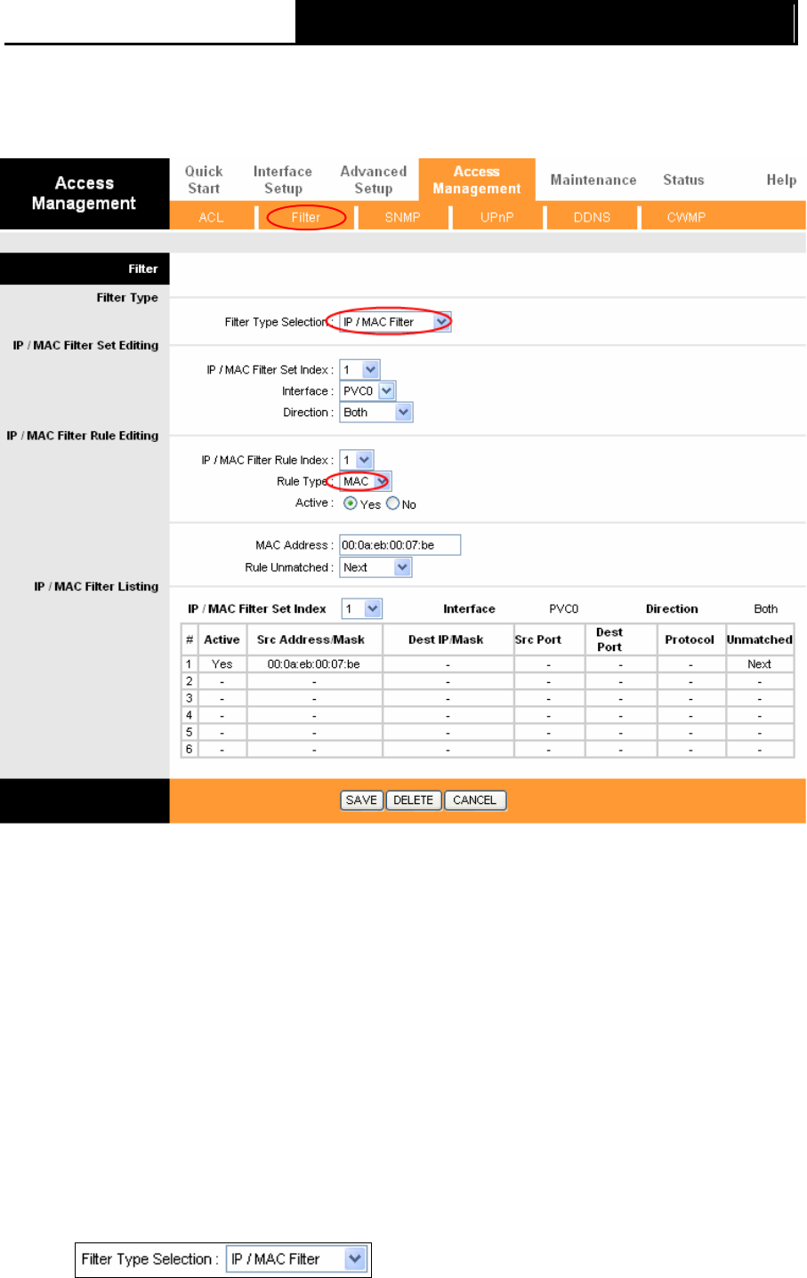 Select IP/Mac Filter as the Filter type, and select MAC as the Rule type (shown in Figure 4-35),