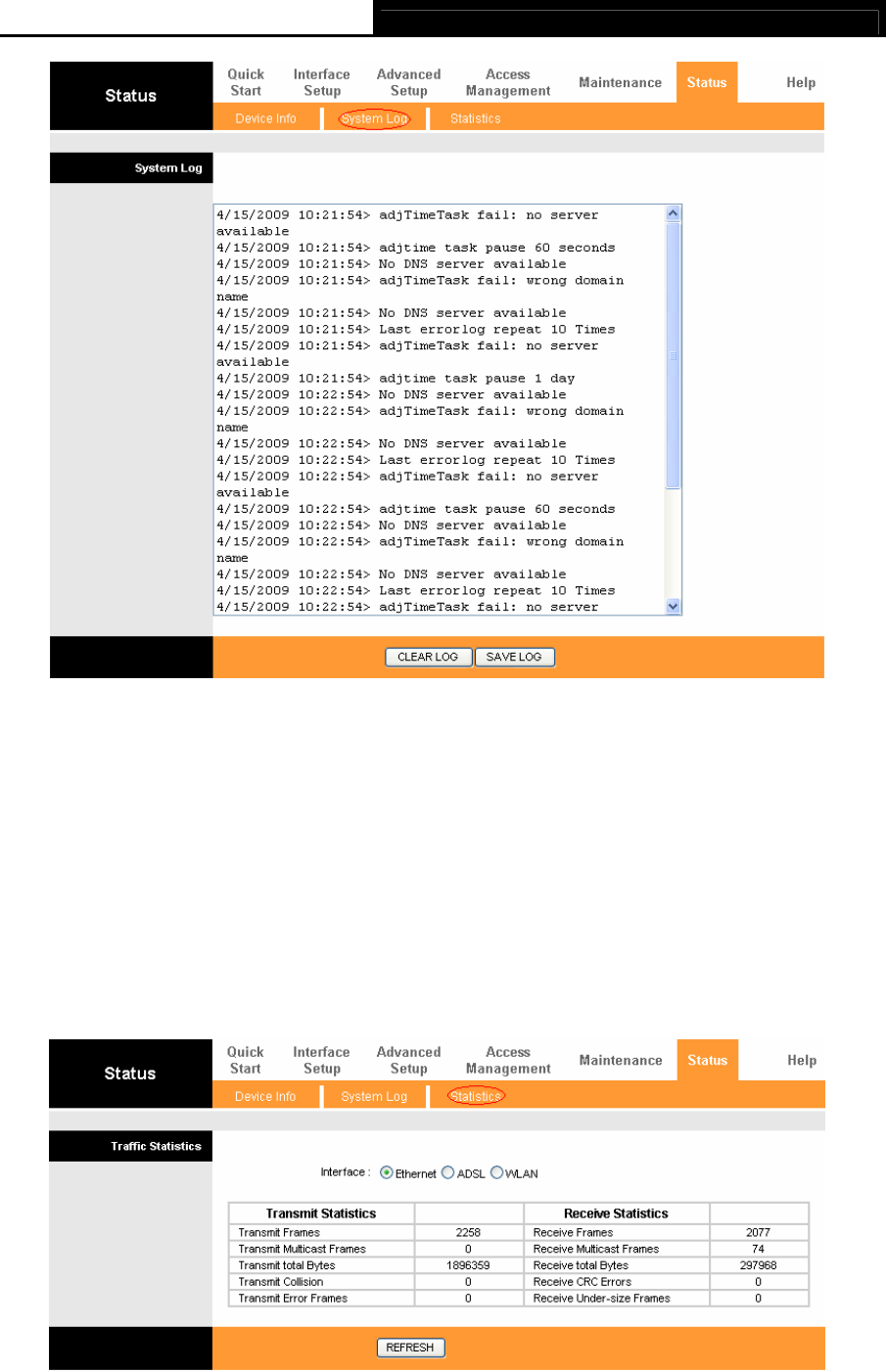 Choose “Status→Statistics” menu, and you will be able to view the network traffic over Ethernet,