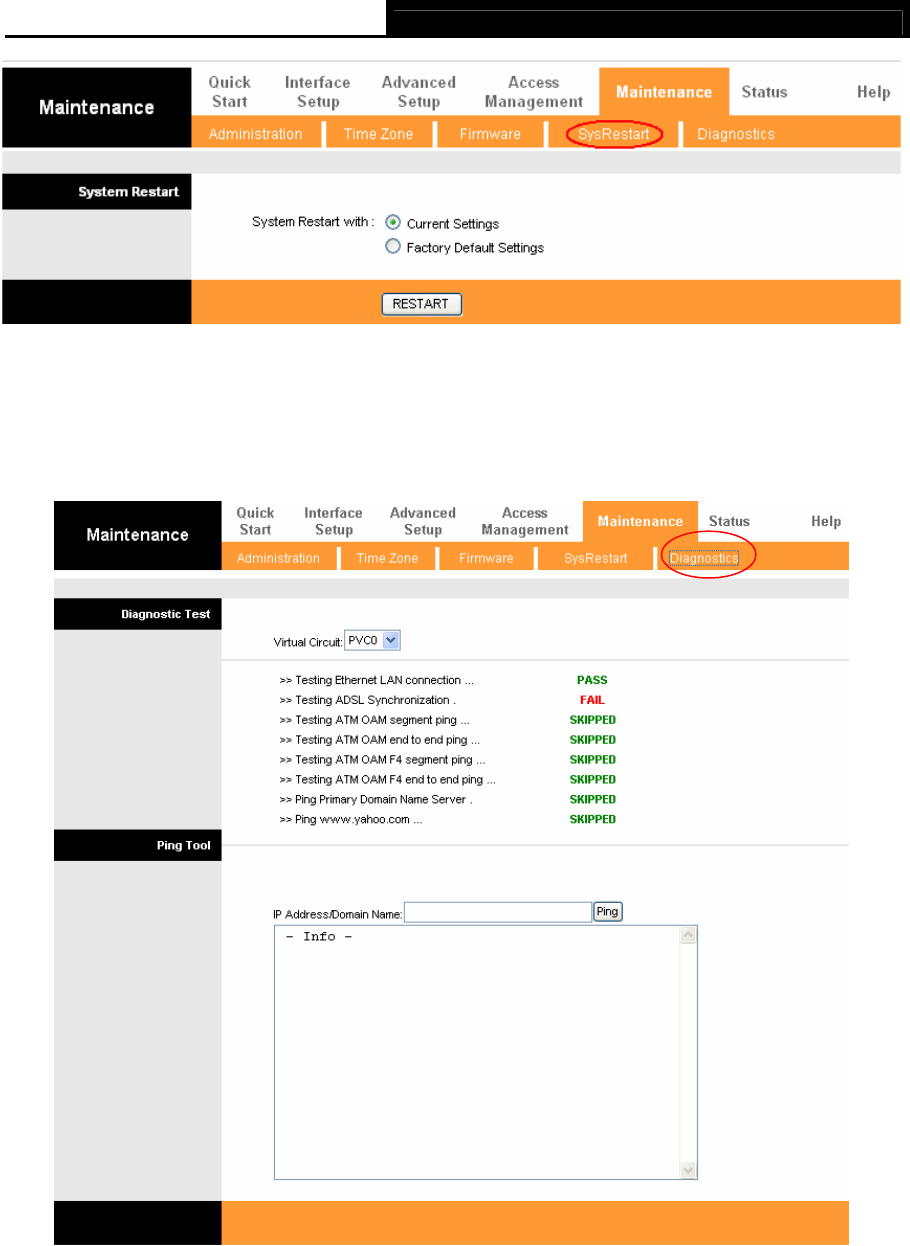 Choose “Maintenance→Diagnostic”, you can view the test results for the connectivity of the