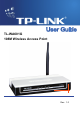 TL-WA601G 108M Wireless Access Point User Guide Chapter 1 Introduction 1.1 Product Overview Thank you for choosing the TL-WA601G 108Mbps Wireless Access Point. This AP provides connectivity between Ethernet wired networks and radio-equipped wireless devices. It adopts 108M Super G™ WLAN Transmission Technology, which offers the highest throughput performance available on the market today, and data rates of up to 108Mbps. In dynamic 108M mode, the router can attach IEEE 802.11b, 802.