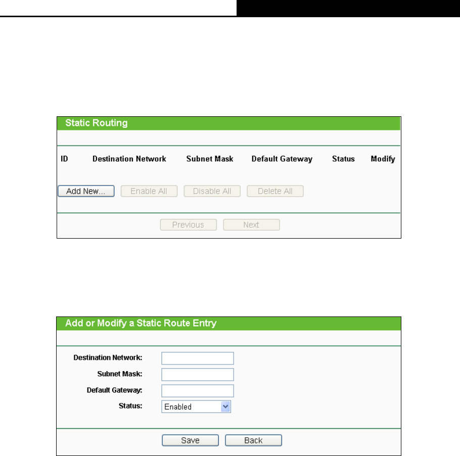 Choose menu “Advanced Routing → Static Routing List”, and then you can configure the